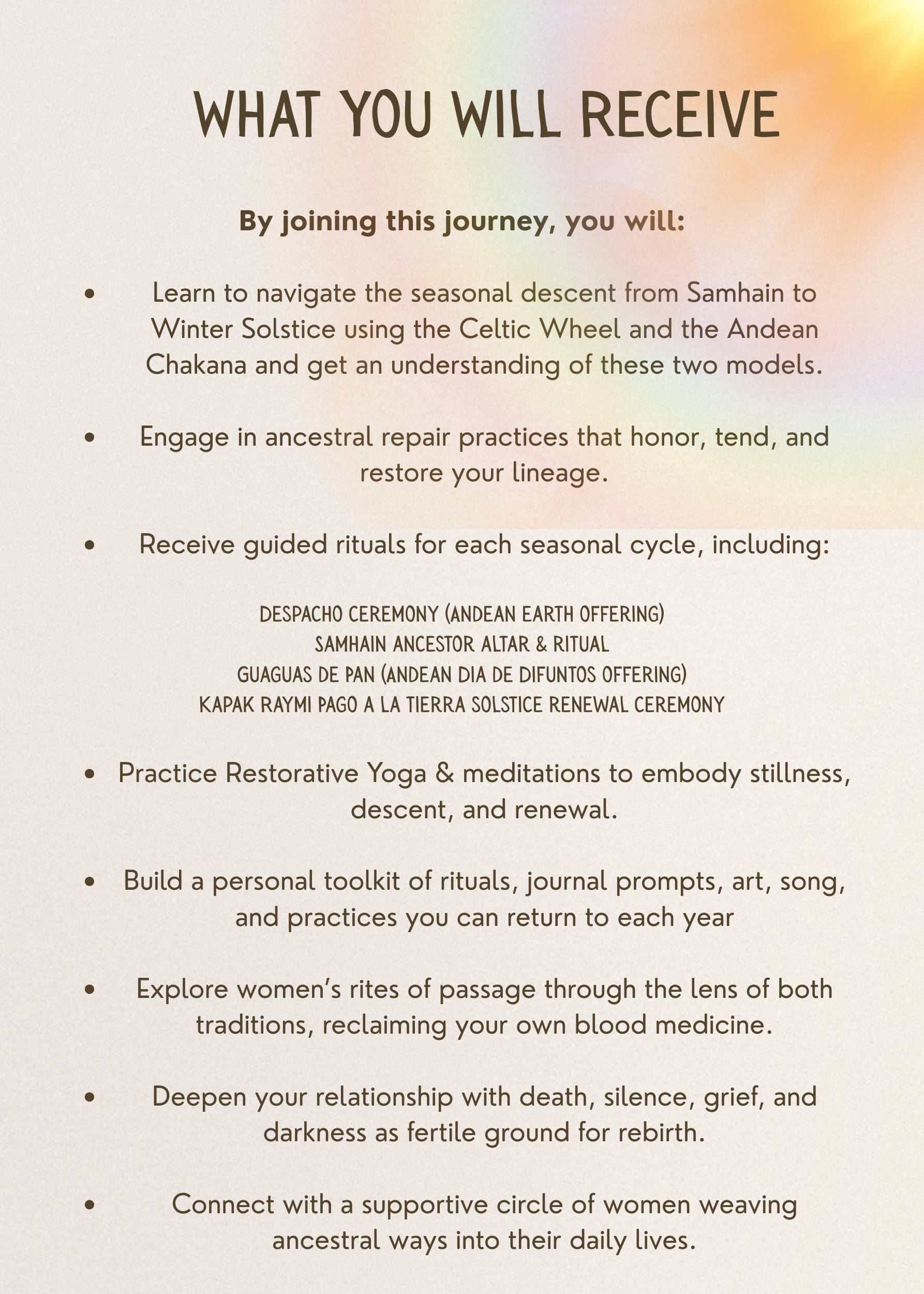 MOVING BETWEEN Celtic seasonal gateways and Andean cosmic wisdom, guided by ancestral practices, ritual, and women’s rites of passage. Together, we listen for what must be released, tend the womb of the earth, and kindle the seeds of new becoming. revitalizing ancestral practices through ritual, storytelling, and women’s cycles of life.